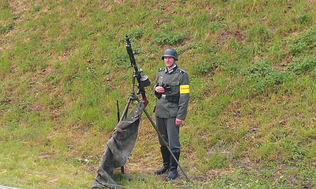 Believe it or not, there is a man standing in this picture. It may look like a harmless artistic photograph of a grassy bank with a metal pipe sticking out of it but if you look….really closely…you’ll see….there is a man dressed as a World War II German soldier. Can you see him now?