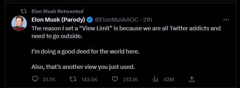 Twitter, the second front of our perfect storm, recently started limiting the number of posts users who didn’t subscribe to the blue tick could read. At time of press, it was about 800 posts but that might change by the time anyone actually reads this post. Master of all Baters – Mr Musk, posted in his twisted gloaty maniacally evil genius tone that the reason was to help people get over their addiction to swiping.