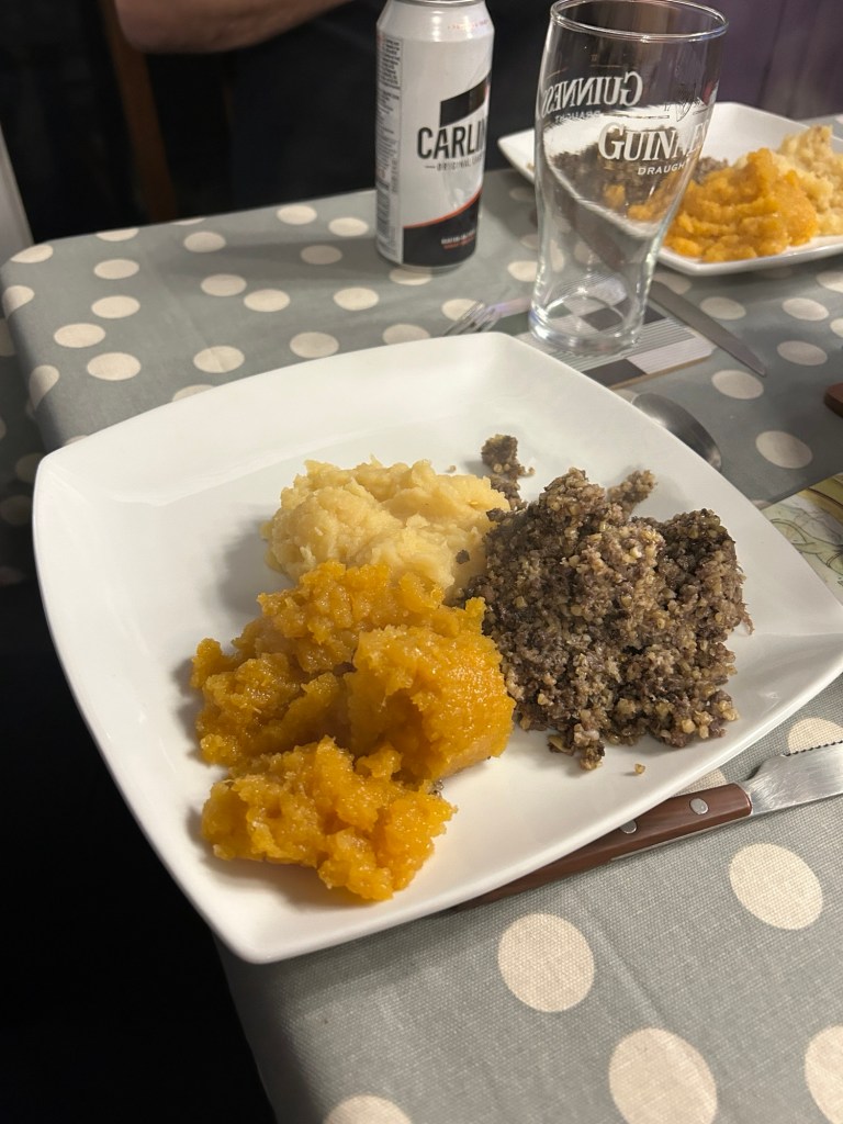 Now an annual tradition, at D&D last night our esteemed host Mark put on a fine spread of haggis, neeps and tatties.